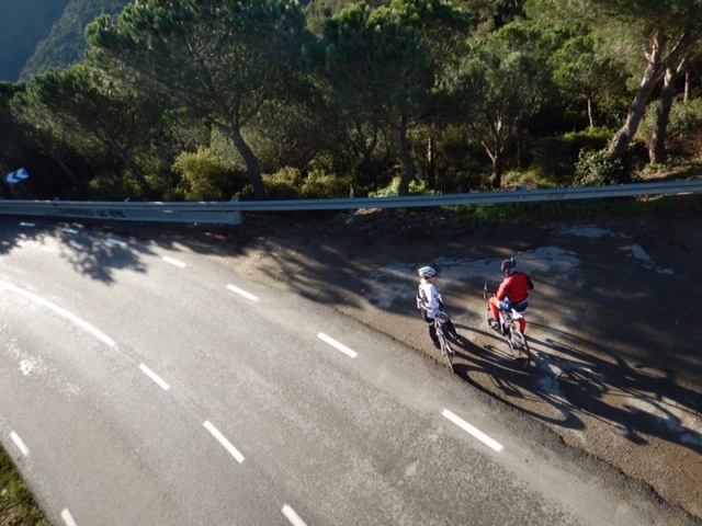 Det var riktigt fint att få cykla upp och se solen gå upp över staden och havet utanför. Ganska kall vind men fint med sol och härlig klättring. Första utförslöpan i skugga höll på att knäcken på mina fingrar men i nästa stigning ordnade det hela upp sig igen och det var en njutning att få slingra sig ner tillbaka till Barcelona för en kaffe efter morgonpasset på ca 2,5h.
